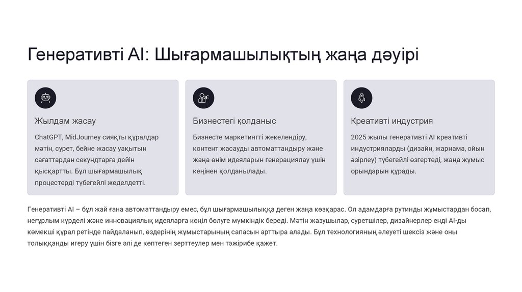 Генеративті AI – бұл жай ғана автоматтандыру емес, бұл шығармашылыққа деген жаңа көзқарас. Ол адамдарға рутинды жұмыстардан босап,