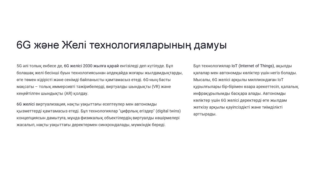 6G және Желі технологияларының дамуы5G әлі толық енбесе де, 6G желісі 2030 жылға қарай енгізіледі деп күтілуде. Бұл