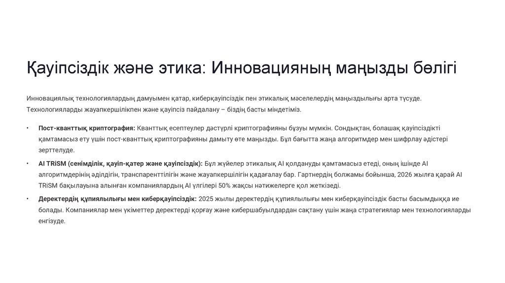 Қауіпсіздік және этика: Инновацияның маңызды бөлігіИнновациялық технологиялардың дамуымен қатар, киберқауіпсіздік пен этикалық мәселелердің маңыздылығы арта түсуде.