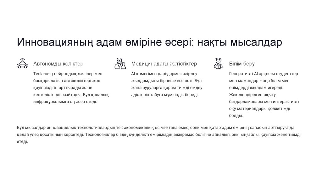 Бұл мысалдар инновациялық технологиялардың тек экономикалық өсімге ғана емес, сонымен қатар адам өмірінің сапасын арттыруға да