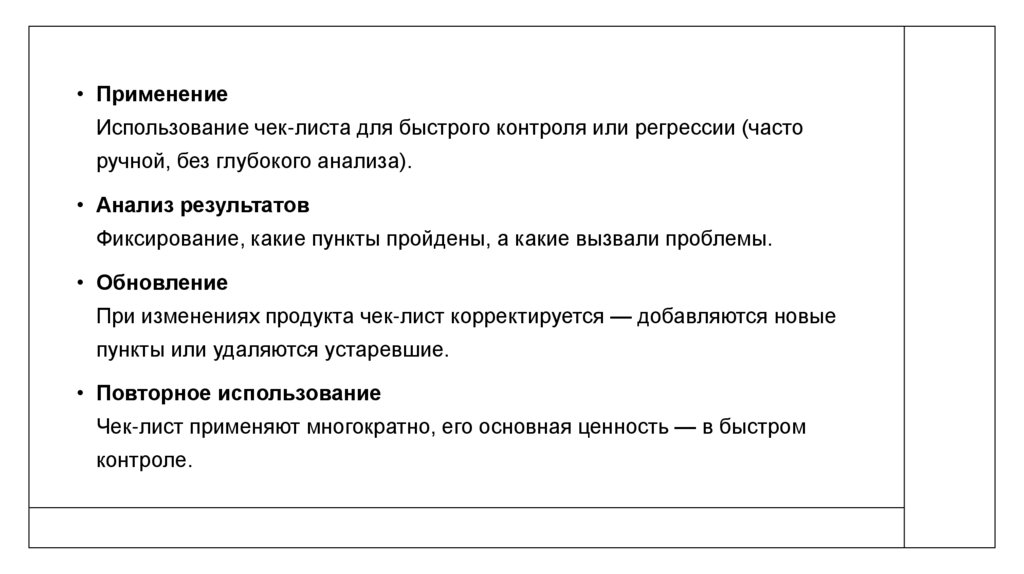 • ПрименениеИспользование чек-листа для быстрого контроля или регрессии (часто