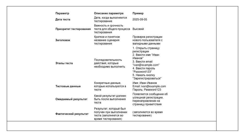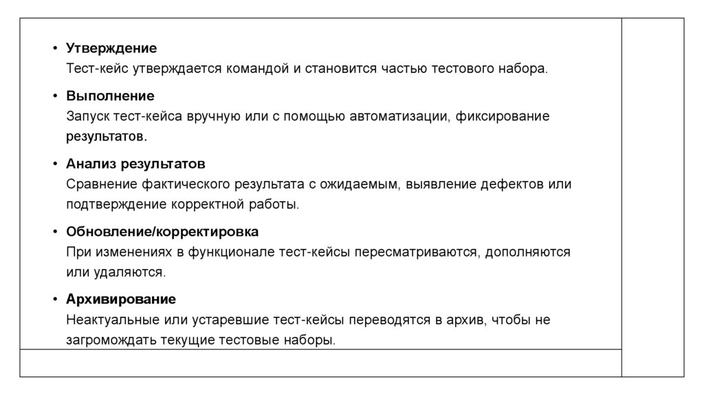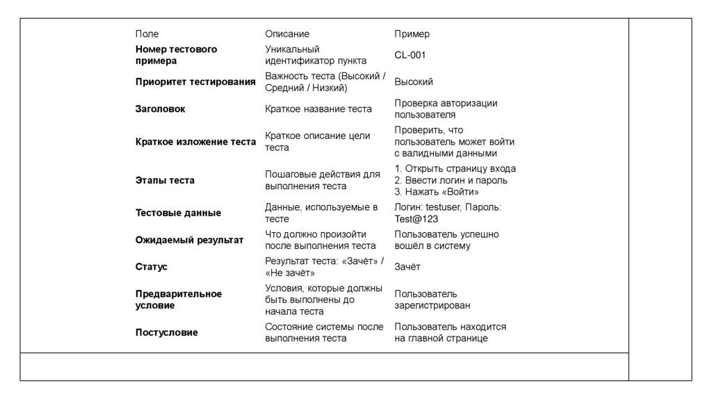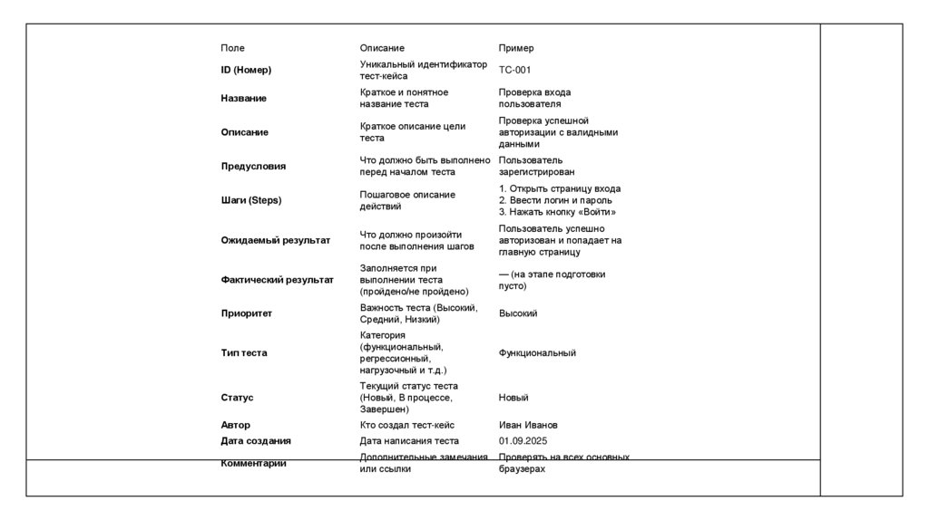 • ОднозначностьКаждый тест-кейс должен иметь чёткое описание, чтобы любой