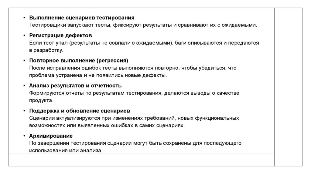 • Опишите сценарий тестирования, который отражает общий процесс использования