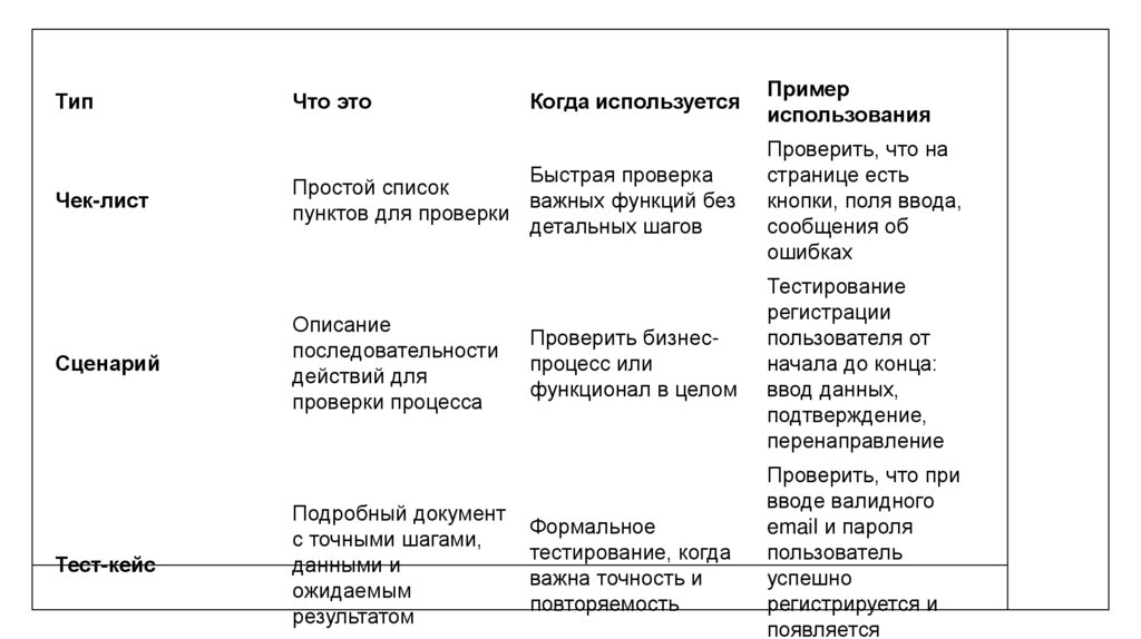 • Чек-лист — это список действий или условий, которые нужно проверить.Используется для быстрой проверки функций или критериев, часто без