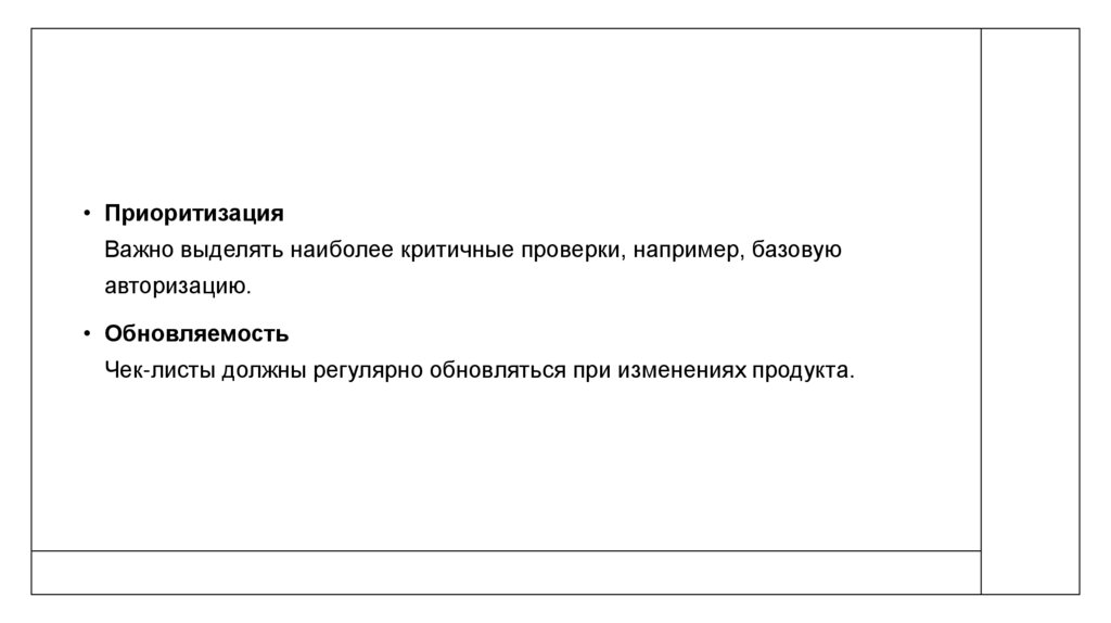 • ПриоритизацияВажно выделять наиболее критичные проверки, например, базовую