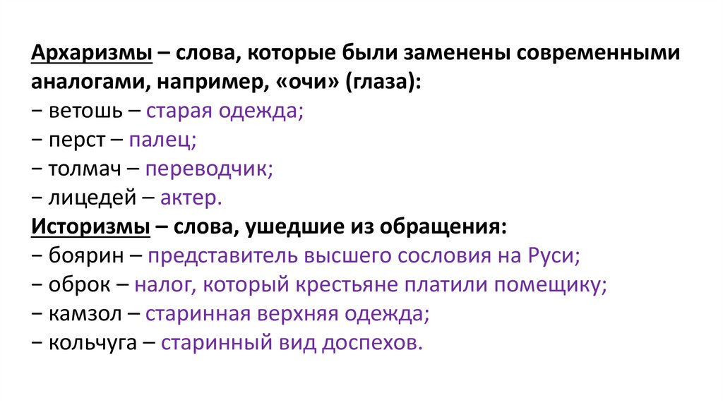 Архаризмы – слова, которые были заменены современнымианалогами, например, «очи» (глаза):