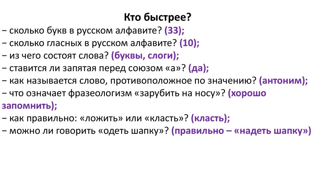 Кто быстрее?− сколько букв в русском алфавите? (33);