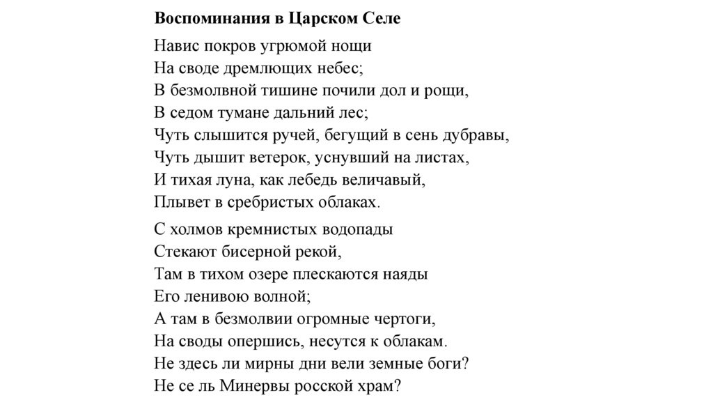Воспоминания в Царском СелеНавис покров угрюмой нощи