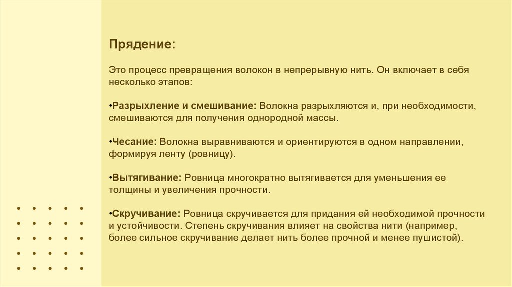Прядение:Это процесс превращения волокон в непрерывную нить. Он включает в себя