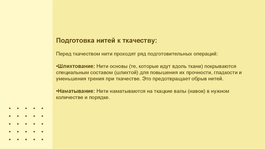 •Шлихтование: Нити основы (те, которые идут вдоль ткани) покрываются