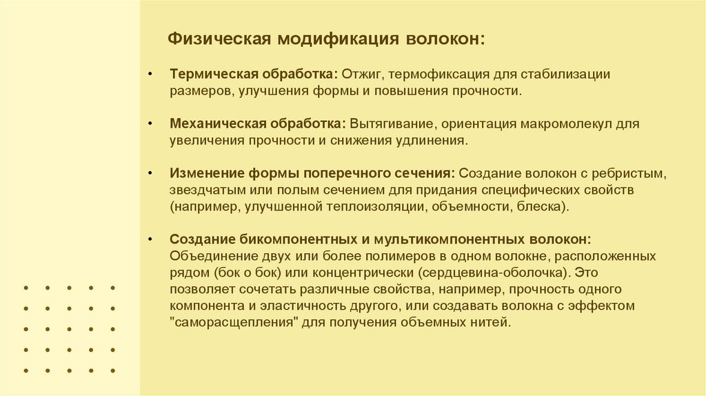 Физическая модификация волокон:Термическая обработка: Отжиг, термофиксация для стабилизации