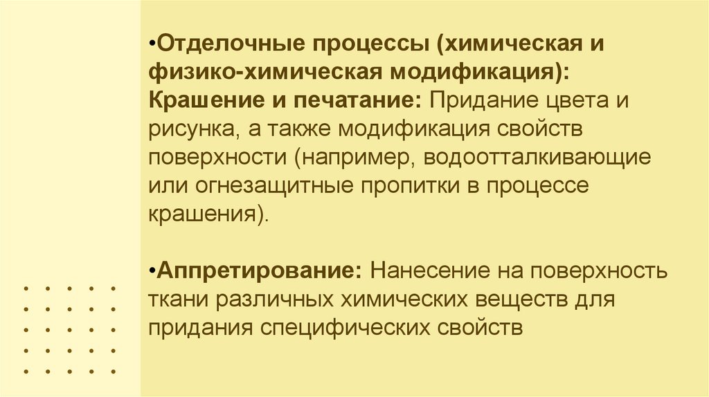 •Отделочные процессы (химическая ифизико-химическая модификация):