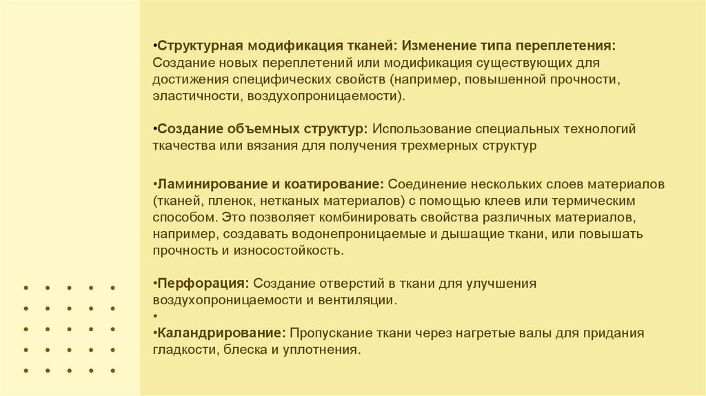 •Структурная модификация тканей: Изменение типа переплетения:Создание новых переплетений или модификация существующих для