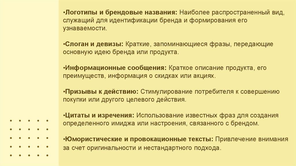 •Слоган и девизы: Краткие, запоминающиеся фразы, передающие