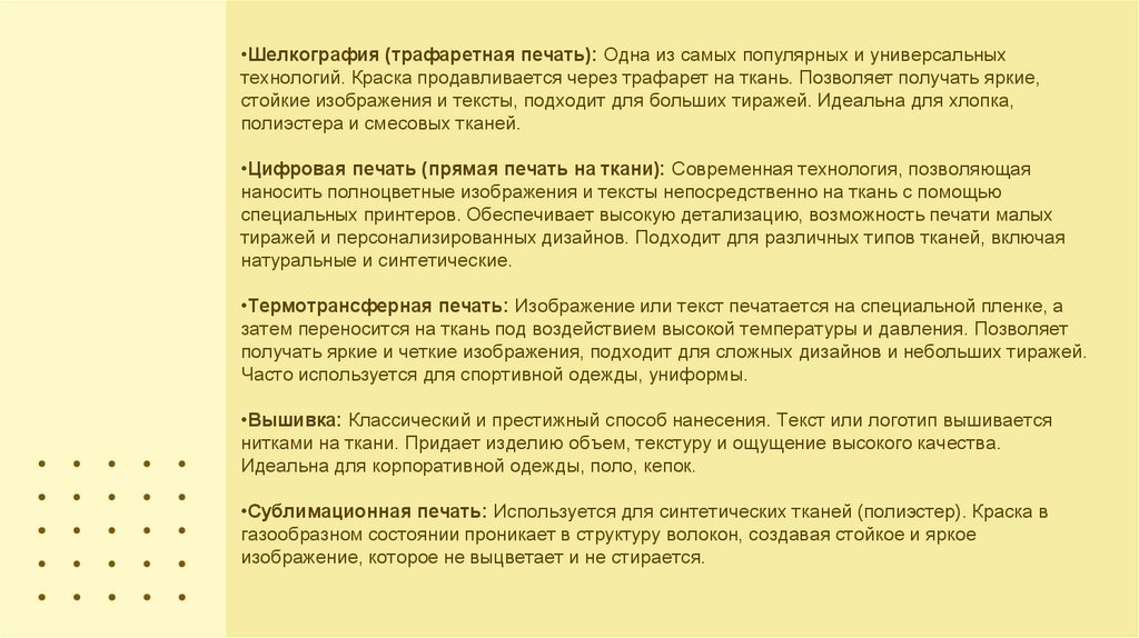 •Шелкография (трафаретная печать): Одна из самых популярных и универсальныхтехнологий. Краска продавливается через трафарет на ткань. Позволяет получать яркие,