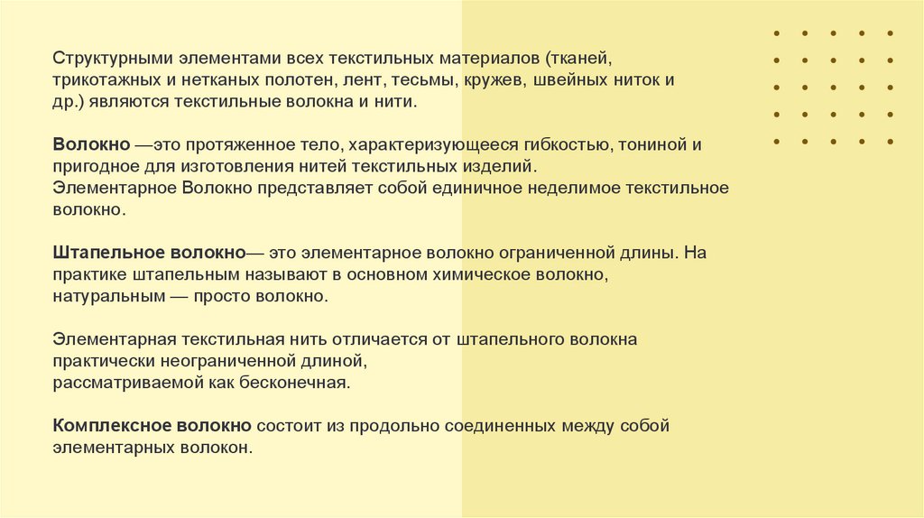 Волокно —это протяженное тело, характеризующееся гибкостью, тониной и