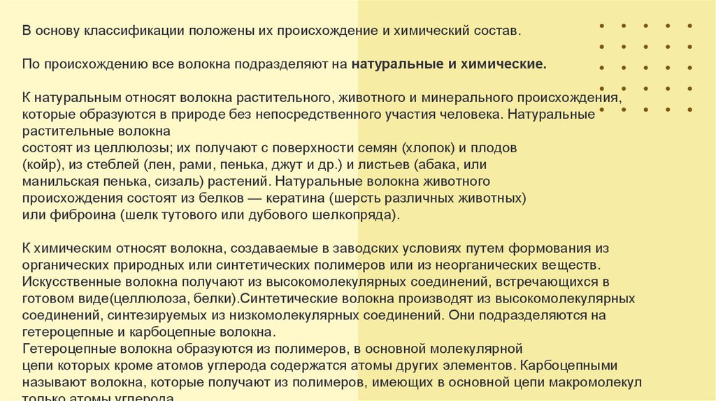В основу классификации положены их происхождение и химический состав.По происхождению все волокна подразделяют на натуральные и химические.
