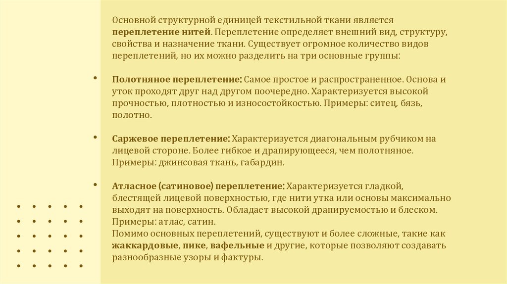Основной структурной единицей текстильной ткани являетсяпереплетение нитей. Переплетение определяет внешний вид, структуру,
