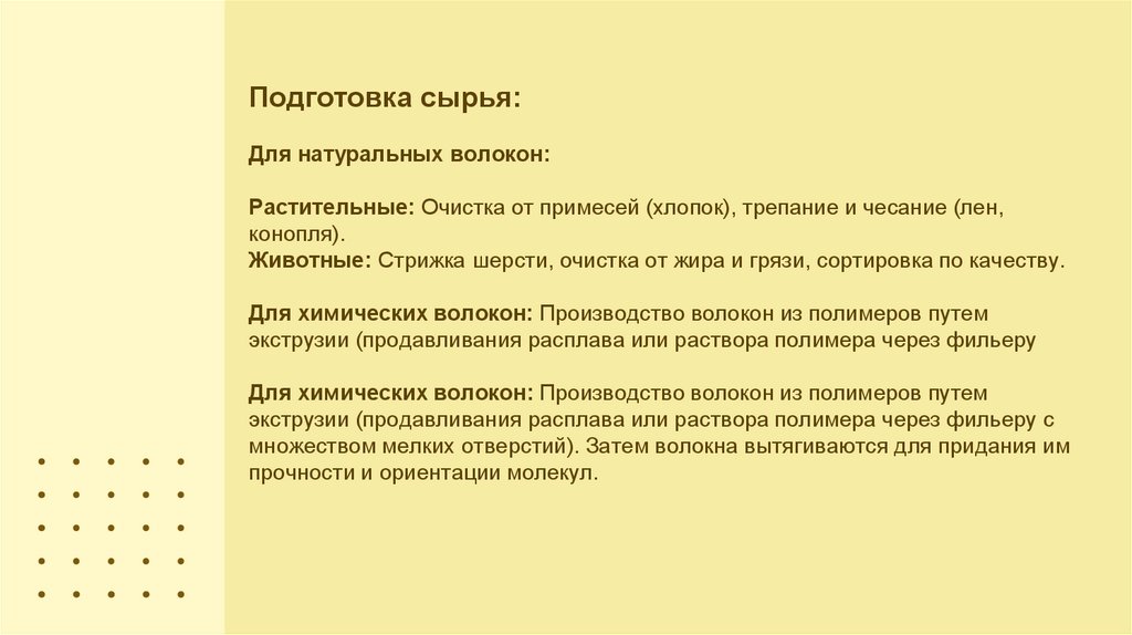 Растительные: Очистка от примесей (хлопок), трепание и чесание (лен,