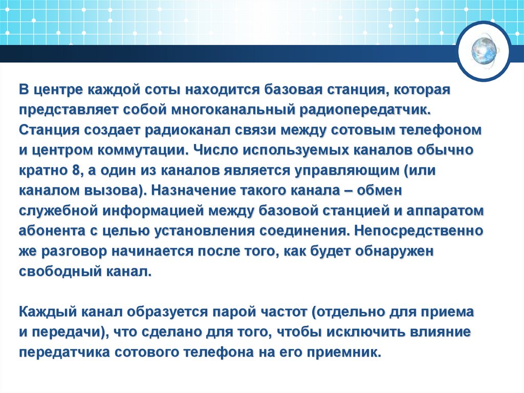 В центре каждой соты находится базовая станция, котораяпредставляет собой многоканальный радиопередатчик.