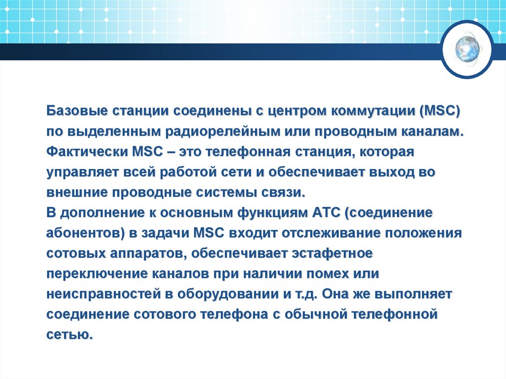 Базовые станции соединены с центром коммутации (MSC)по выделенным радиорелейным или проводным каналам.