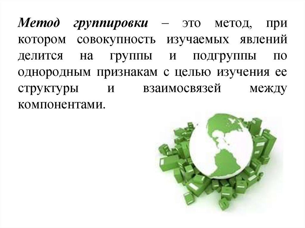 Метод группировки – это метод, прикотором совокупность изучаемых явлений