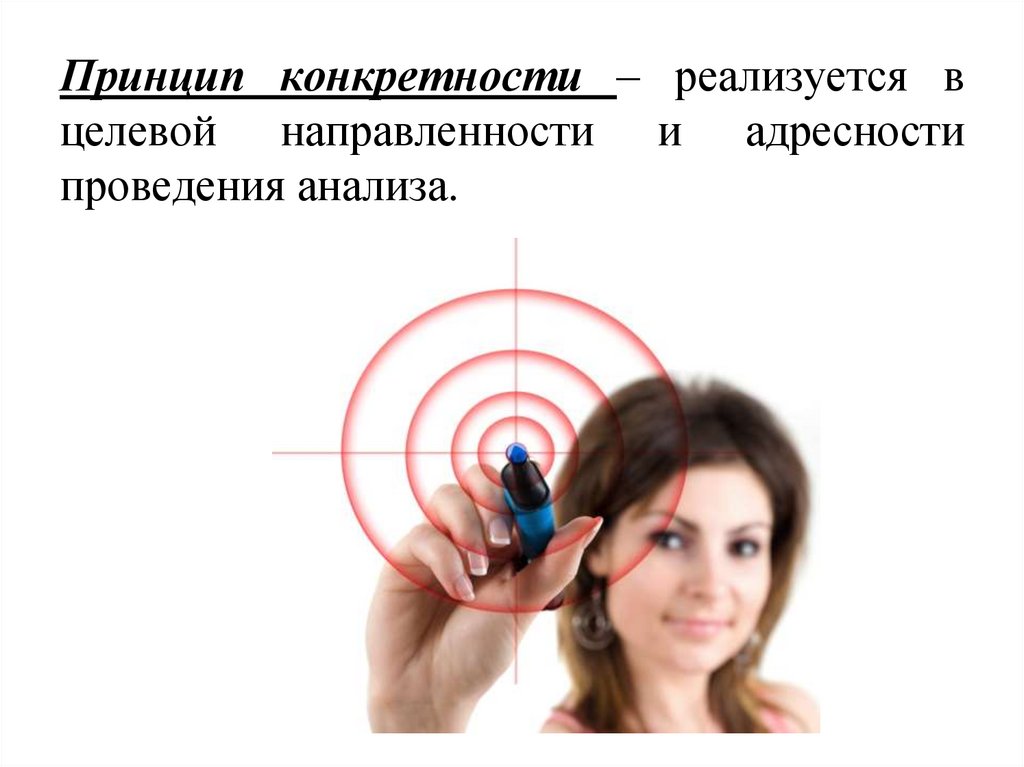 Принцип конкретности – реализуется вцелевой направленности и адресности