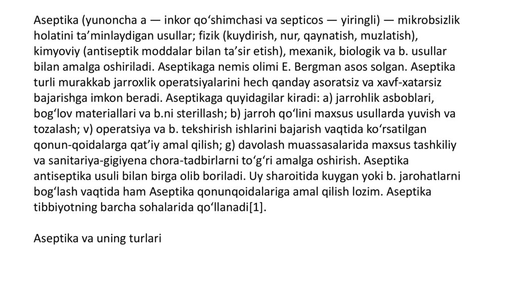 bilan amalga oshiriladi. Aseptikaga nemis olimi E. Bergman asos solgan. Aseptika