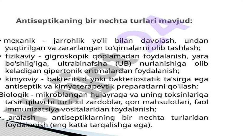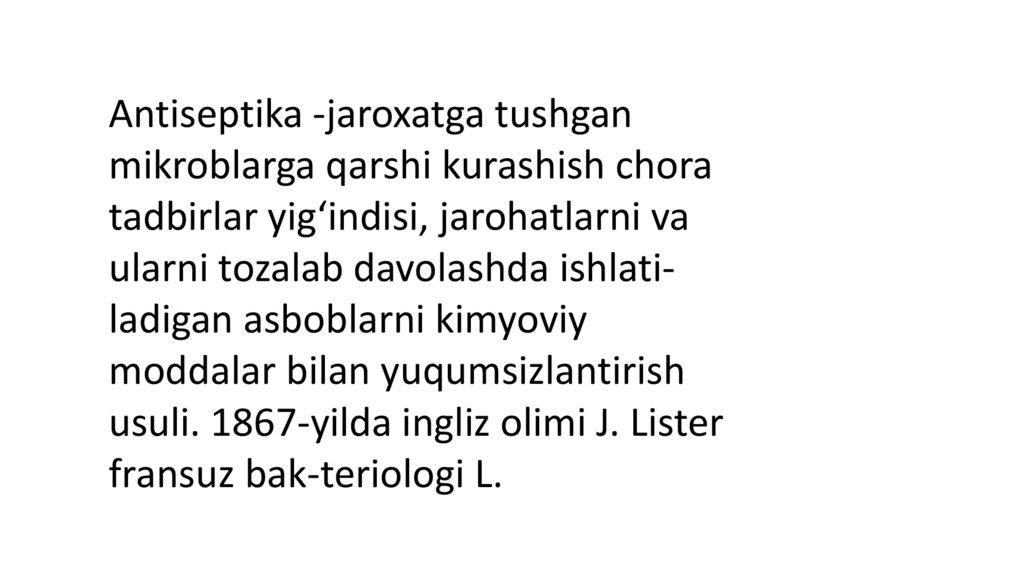 Antiseptika -jaroxatga tushgan mikroblarga qarshi kurashish chora tadbirlaryigʻindisi, jarohatlarni va ularni tozalab davolashda ishlati-ladigan asboblarni