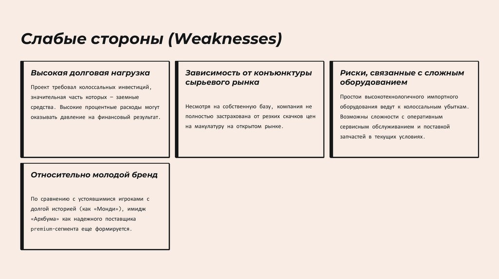 слабость — возможная зависимость от импортной целлюлозы и менее глубокая