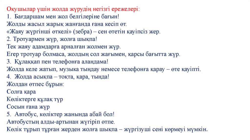 Оқушылар үшін жолда жүрудің негізгі ережелері:1. Бағдаршам мен жол белгілеріне бағын!