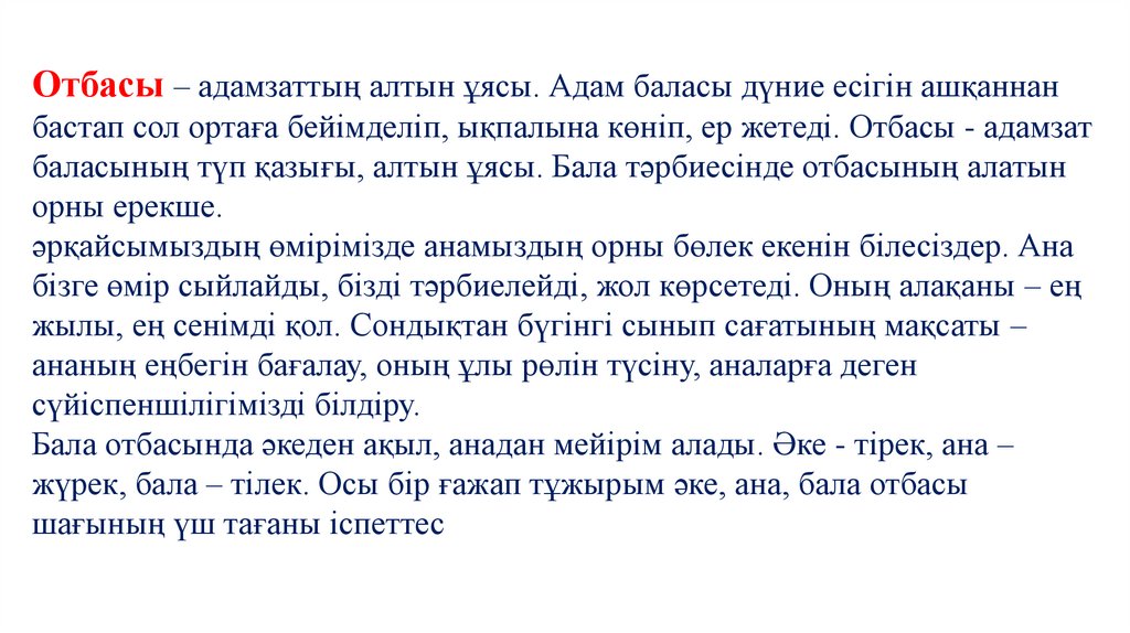 Бала отбасында әкеден ақыл, анадан мейірім алады. Әке - тірек, ана –