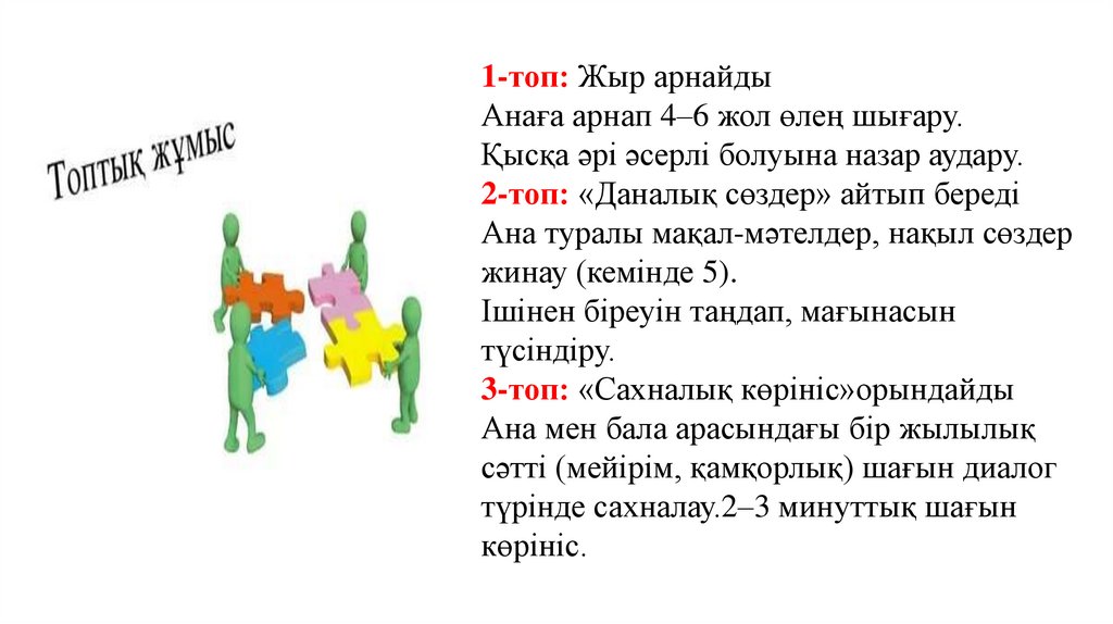 1-топ: Жыр арнайдыАнаға арнап 4–6 жол өлең шығару.
