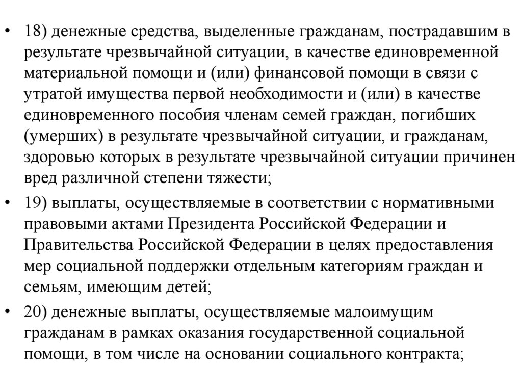 • 18) денежные средства, выделенные гражданам, пострадавшим врезультате чрезвычайной ситуации, в качестве единовременной