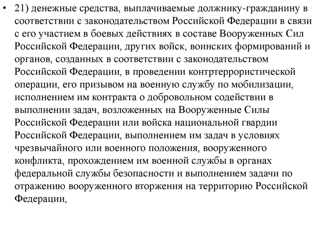 • 21) денежные средства, выплачиваемые должнику-гражданину всоответствии с законодательством Российской Федерации в связи