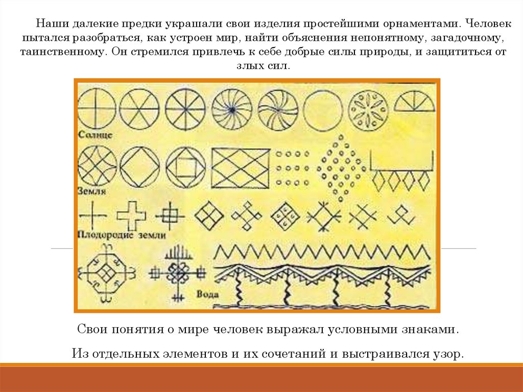 Наши далекие предки украшали свои изделия простейшими орнаментами. Человекпытался разобраться, как устроен мир, найти объяснения непонятному, загадочному,