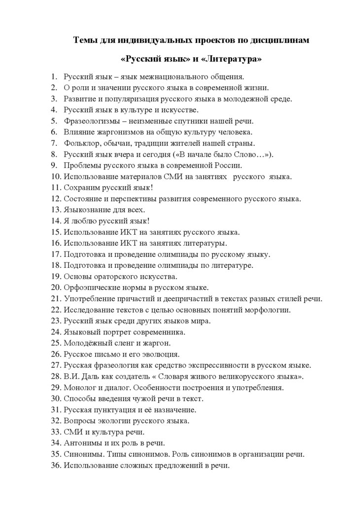 Темы для индивидуальных проектов по дисциплинам«Русский язык» и «Литература»