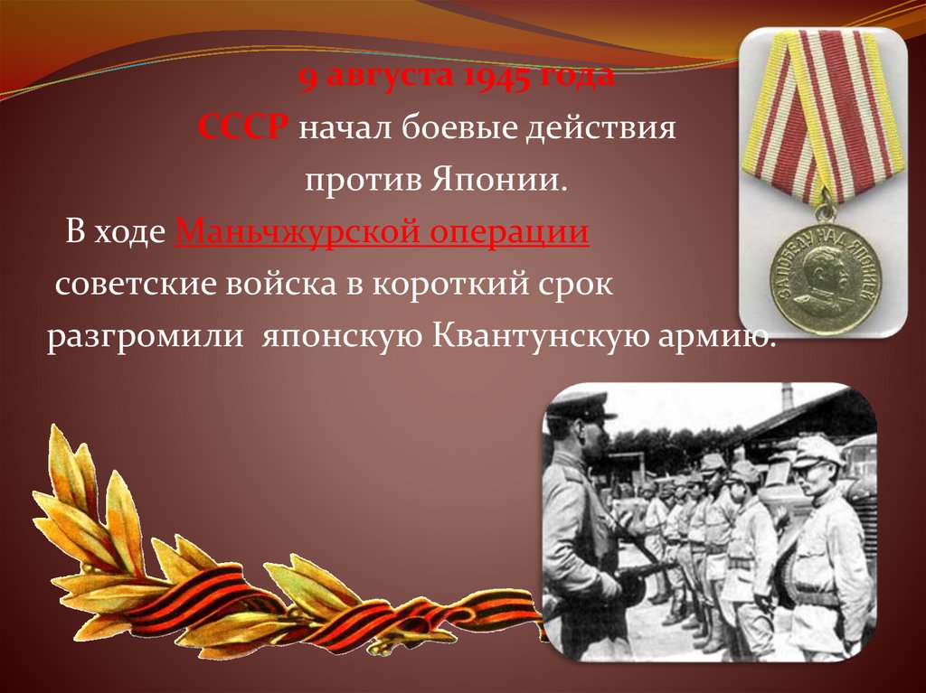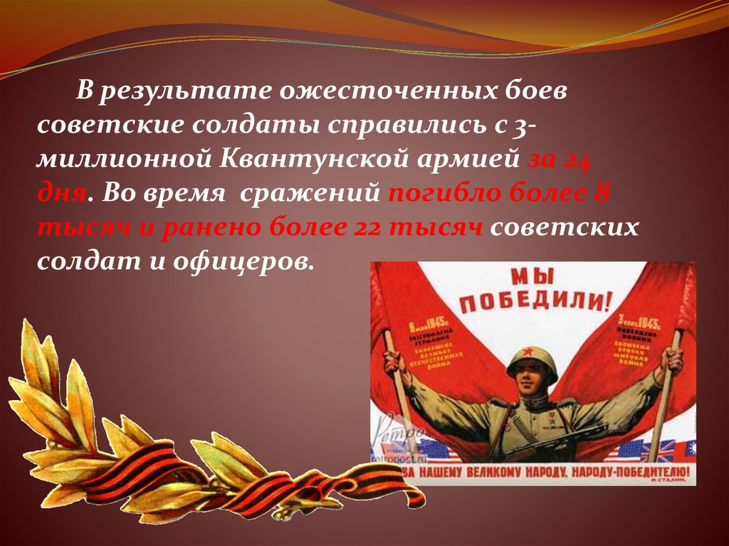 В результате ожесточенных боевсоветские солдаты справились с 3миллионной Квантунской армией за 24