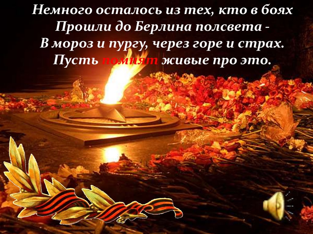 Немного осталось из тех, кто в бояхПрошли до Берлина полсвета В мороз и пургу, через горе и страх.