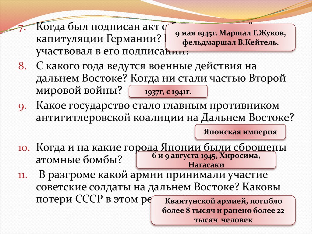 7. Когда был подписан акт о безоговорочной9 мая 1945г. Маршал Г.Жуков,