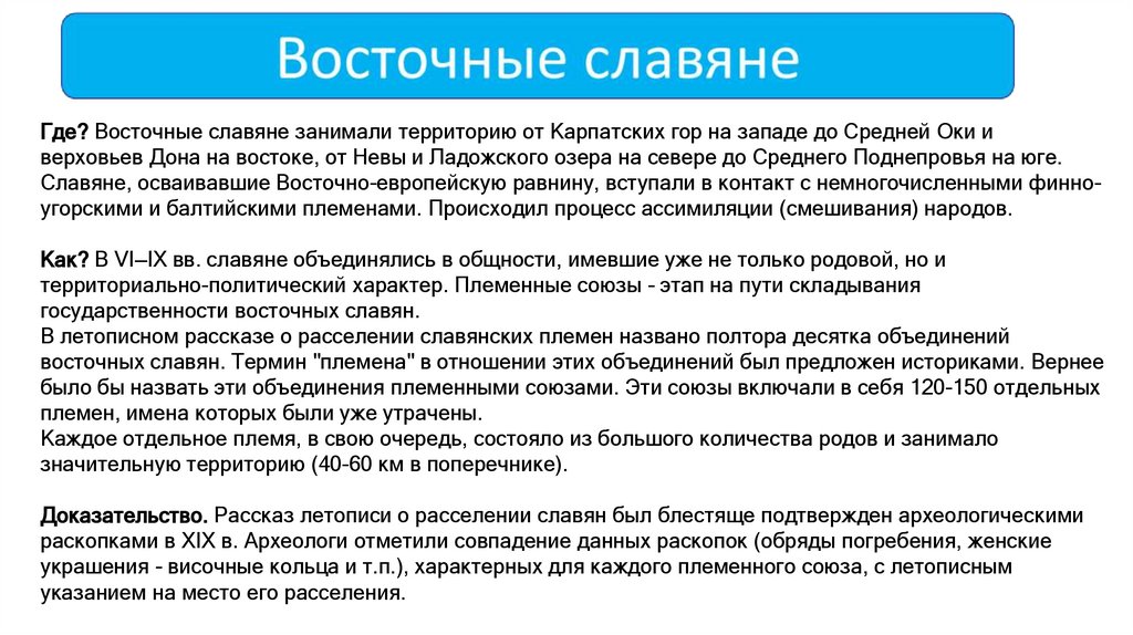 Славяне, осваивавшие Восточно-европейскую равнину, вступали в контакт с немногочисленными финноугорскими и балтийскими племенами. Происходил процесс ассимиляции (смешивания) народов.