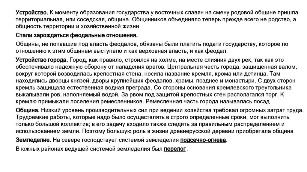 Устройство. К моменту образования государства у восточных славян на смену родовой общине пришлатерриториальная, или соседская, община. Общинников объединяло теперь прежде всего не родство, а