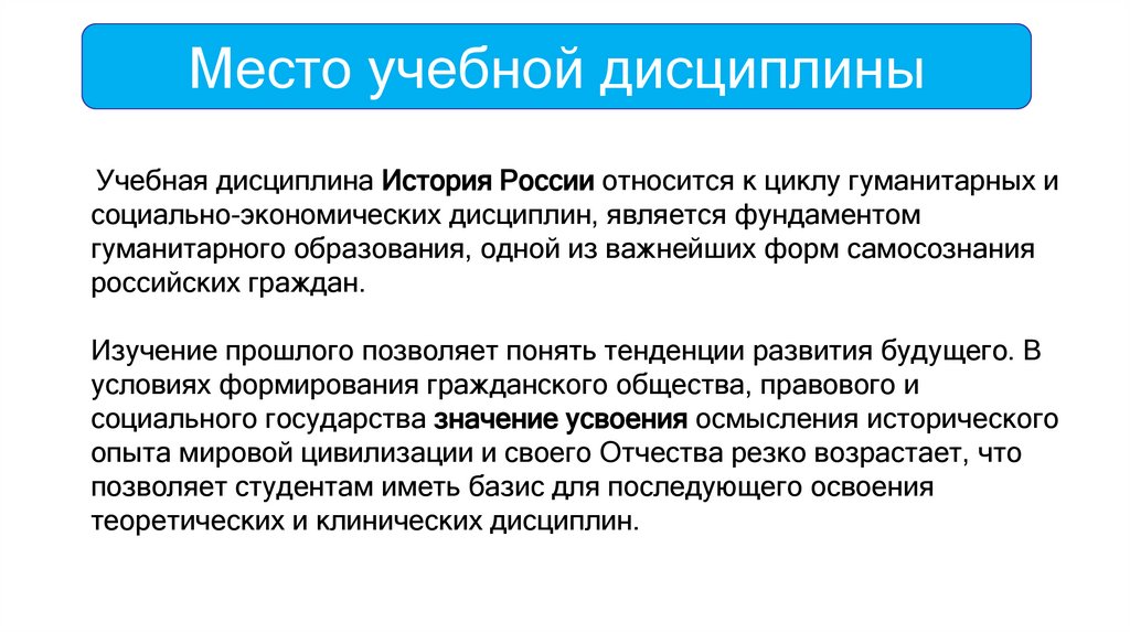 Место учебной дисциплиныУчебная дисциплина История России относится к циклу гуманитарных и