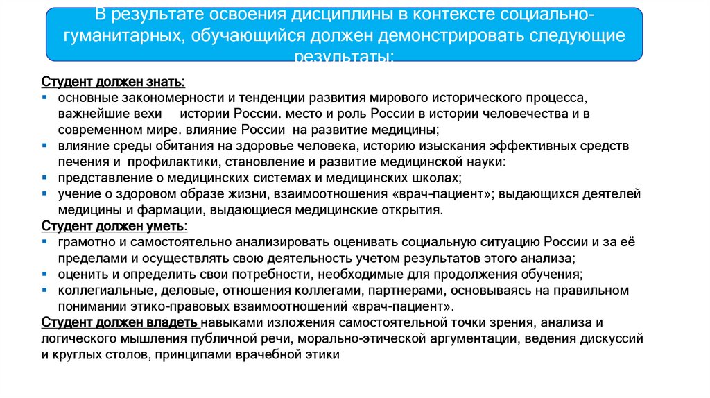 В результате освоения дисциплины в контексте социальногуманитарных, обучающийся должен демонстрировать следующиерезультаты: