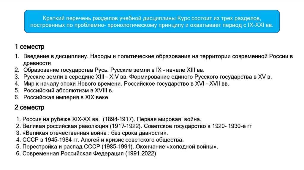 Краткий перечень разделов учебной дисциплины Курс состоит из трех разделов,построенных по проблемно- хронологическому принципу и охватывает период с IX-XXI вв.