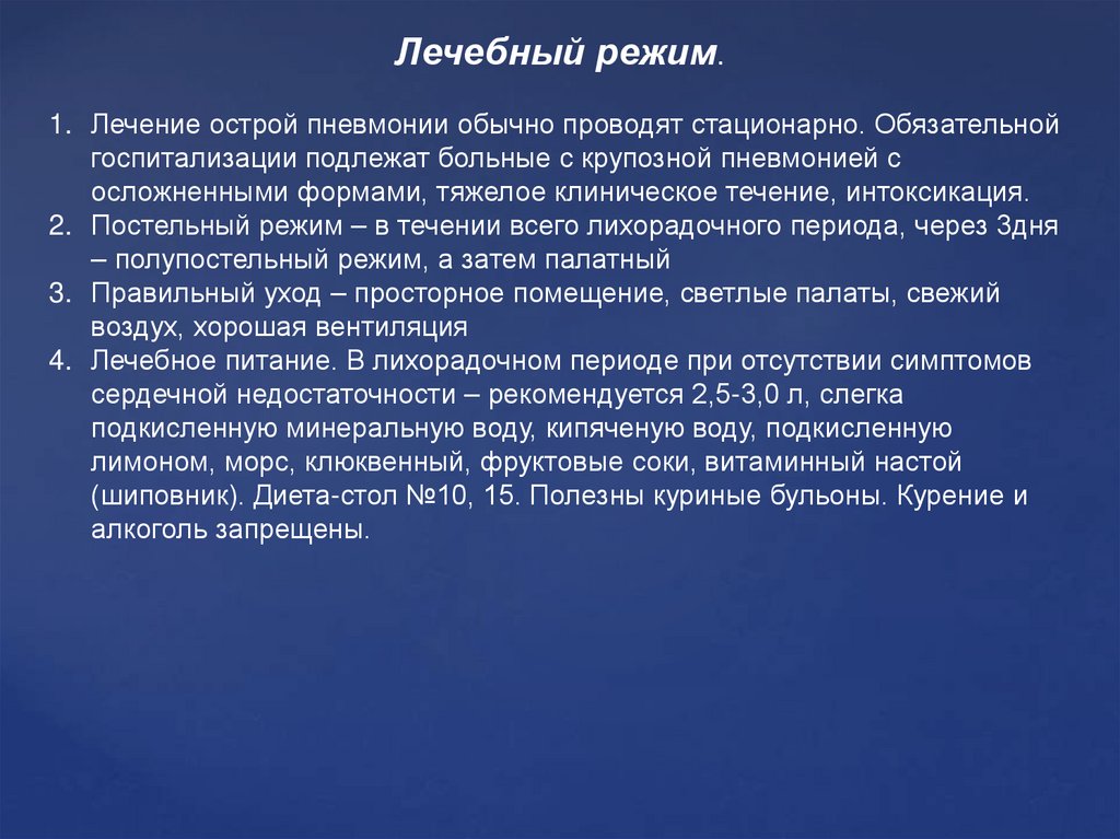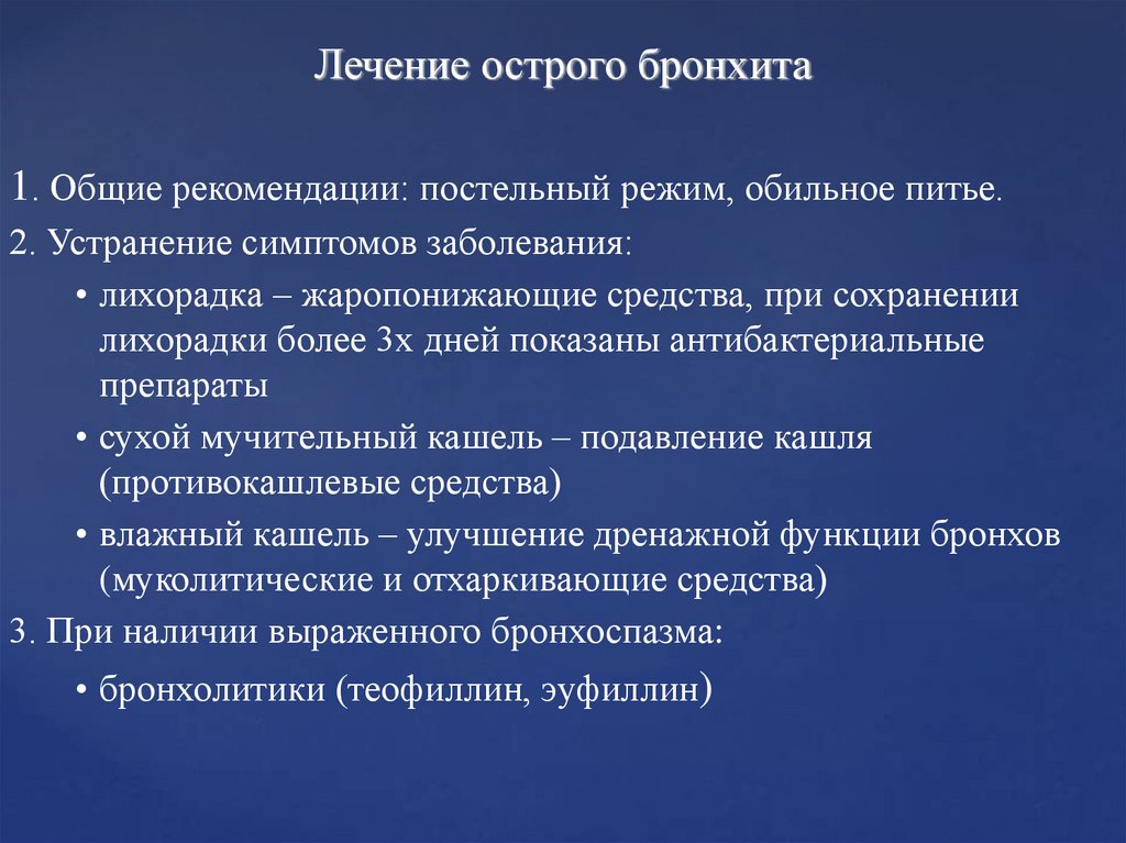 Лечение острого бронхита1. Общие рекомендации: постельный режим, обильное питье.