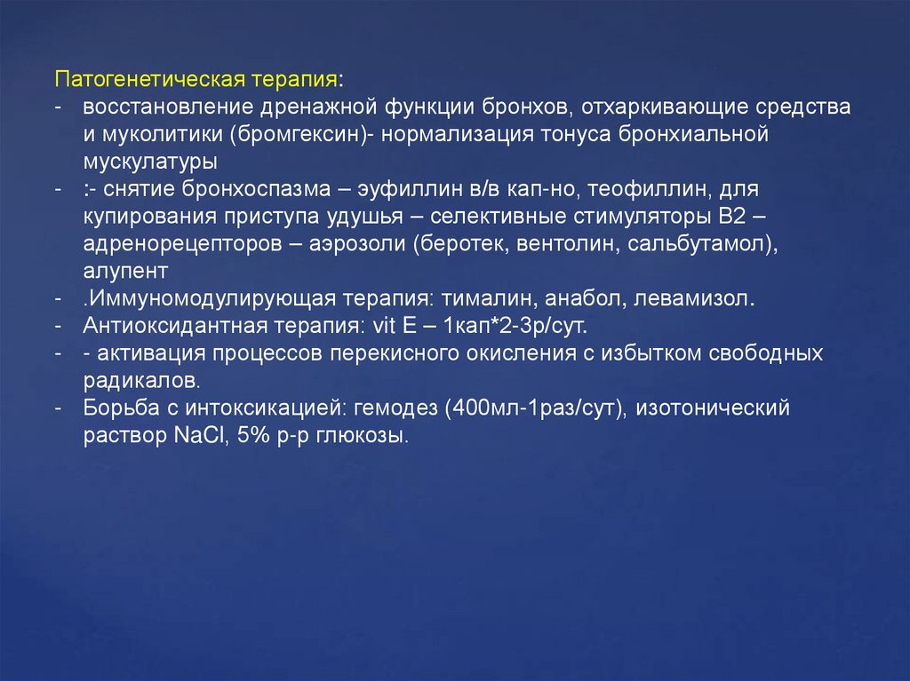 Патогенетическая терапия:- восстановление дренажной функции бронхов, отхаркивающие средства