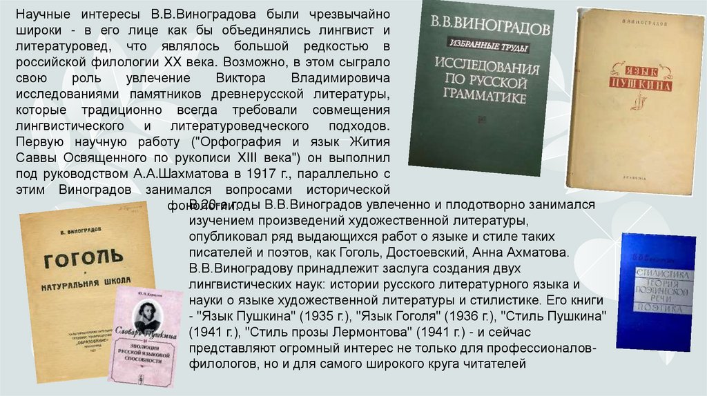 Научные интересы В.В.Виноградова были чрезвычайношироки - в его лице как бы объединялись лингвист и