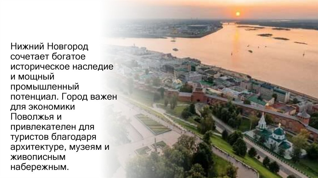 1. Нижний Новгород:– Расположение: на слиянии рек Волги и Оки.