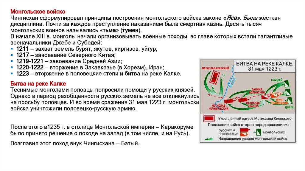 Монгольское войскоЧингисхан сформулировал принципы построения монгольского войска законе «Яса». Была жёсткая
